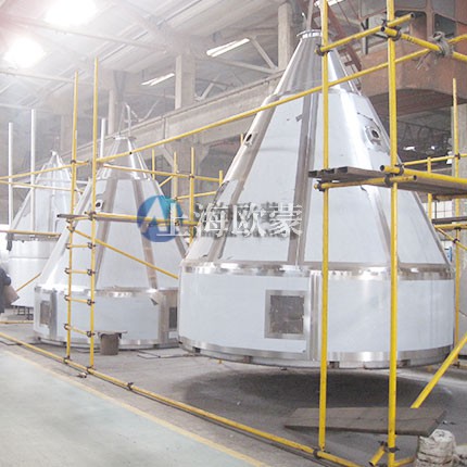 離心噴霧干燥機干燥室的形狀、大小與霧化器的形式、空氣分布器、尾氣排出管、排粉方式有關,取決于乳品的性質(zhì)和對制品的要求。乳品干燥中主要用:垂直下降并流型。這種形式的的熱和氣流和液滴相接處,雖然氣流溫度高,其熱量都供給水分蒸發(fā),實際液滴表面溫度接近濕球溫度,故仍能保持物料原有的特性。